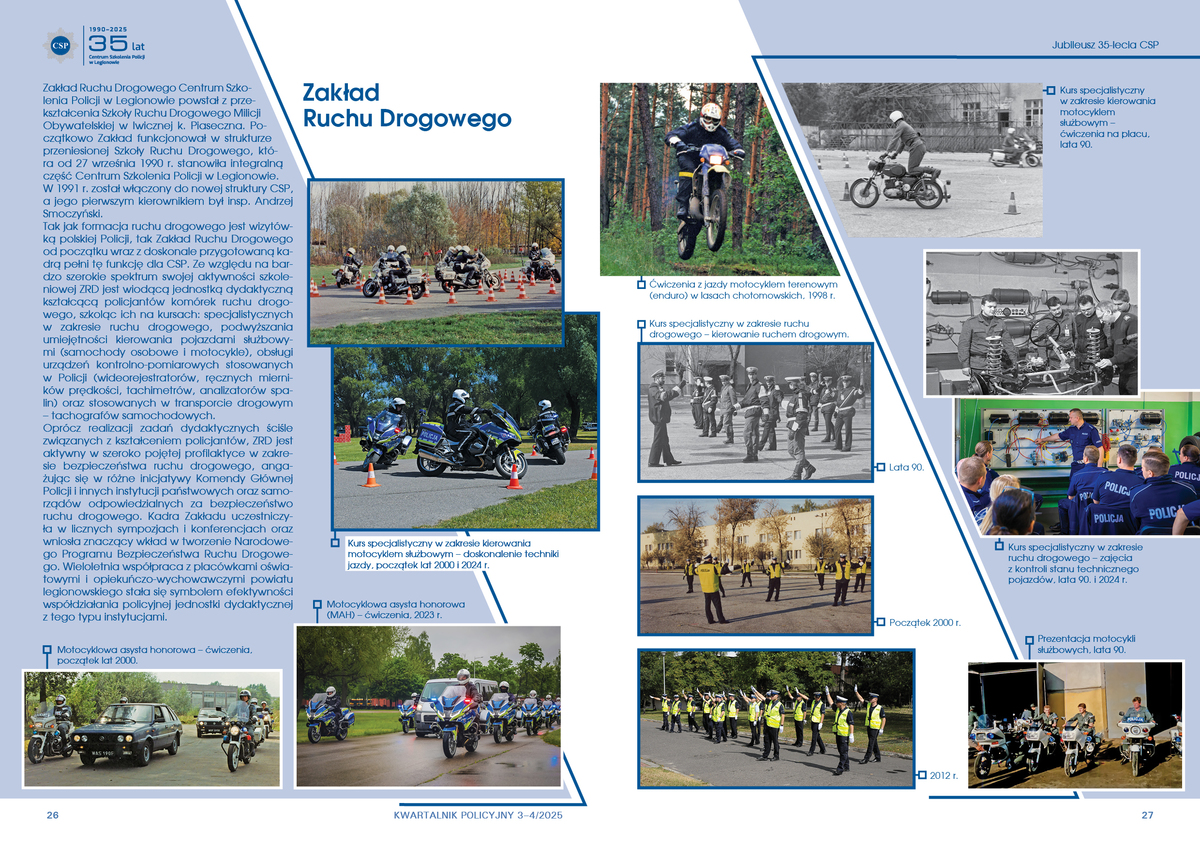 Tak jak formacja ruchu drogowego jest wizytówką polskiej Policji, tak Zakład Ruchu Drogowego od początku wraz z doskonale przygotowaną kadrą pełni tę funkcję dla CSP. Ze względu na bardzo szerokie spektrum swojej aktywności szkoleniowej ZRD jest wiodącą jednostką dydaktyczną kształcącą policjantów komórek ruchu drogowego, szkoląc ich na kursach: specjalistycznych w zakresie ruchu drogowego, podwyższania umiejętności kierowania pojazdami służbowymi (samochody osobowe i motocykle), obsługi urządzeń kontrolno-pomiarowych stosowanych w Policji (wideorejestratorów, ręcznych mierników prędkości, tachimetrów, analizatorów spalin) oraz stosowanych w transporcie drogowym – tachografów samochodowych.
