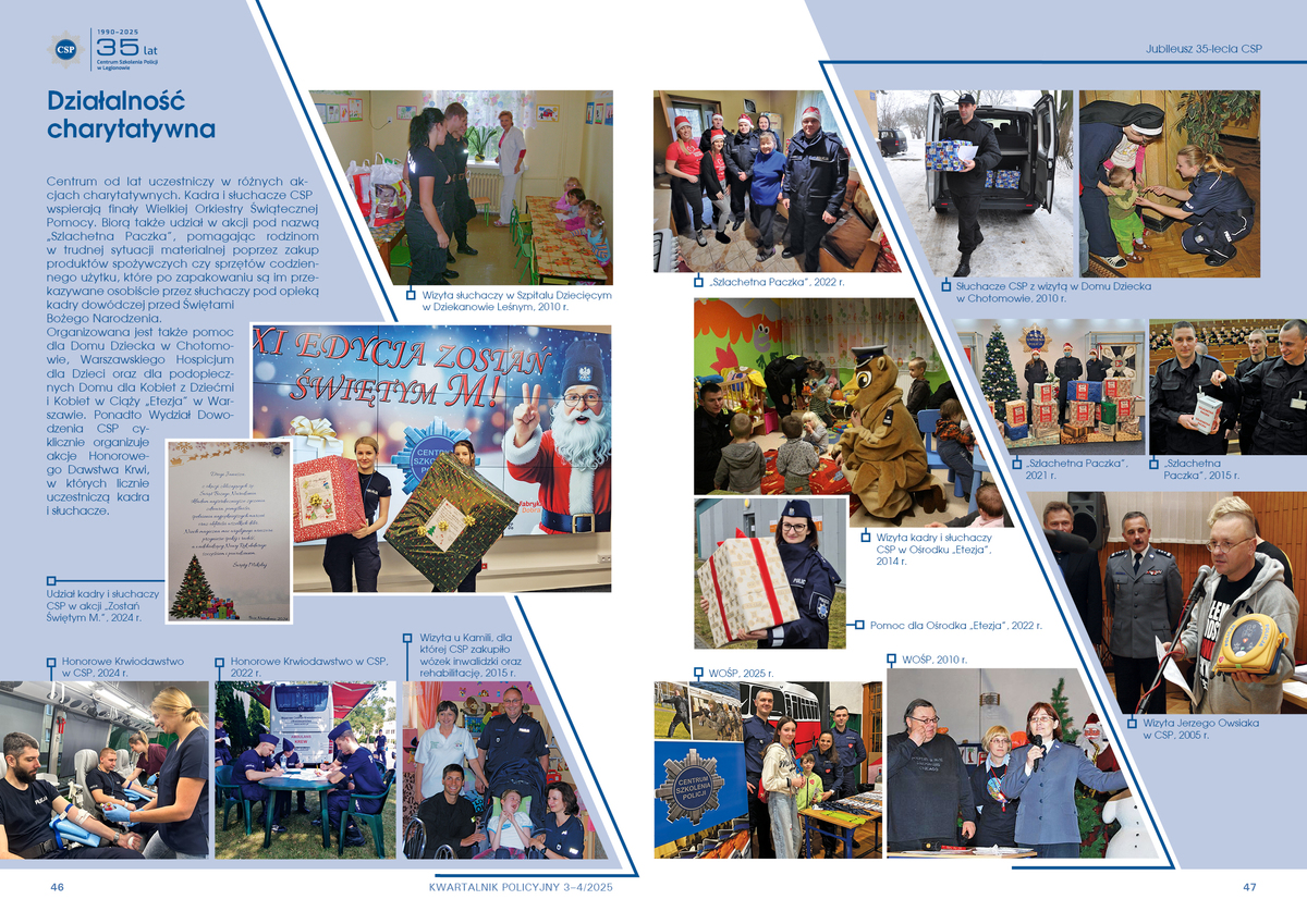 Organizowana jest także pomoc dla Domu Dziecka w Chotomowie, Warszawskiego Hospicjum dla Dzieci oraz dla podopiecznych Domu dla Kobiet z Dziećmi i Kobiet w Ciąży „Etezja” w Warszawie. Ponadto Wydział Dowodzenia CSP cyklicznie organizuje akcje Honorowego Dawstwa Krwi, w których licznie uczestniczą kadra i słuchacze.