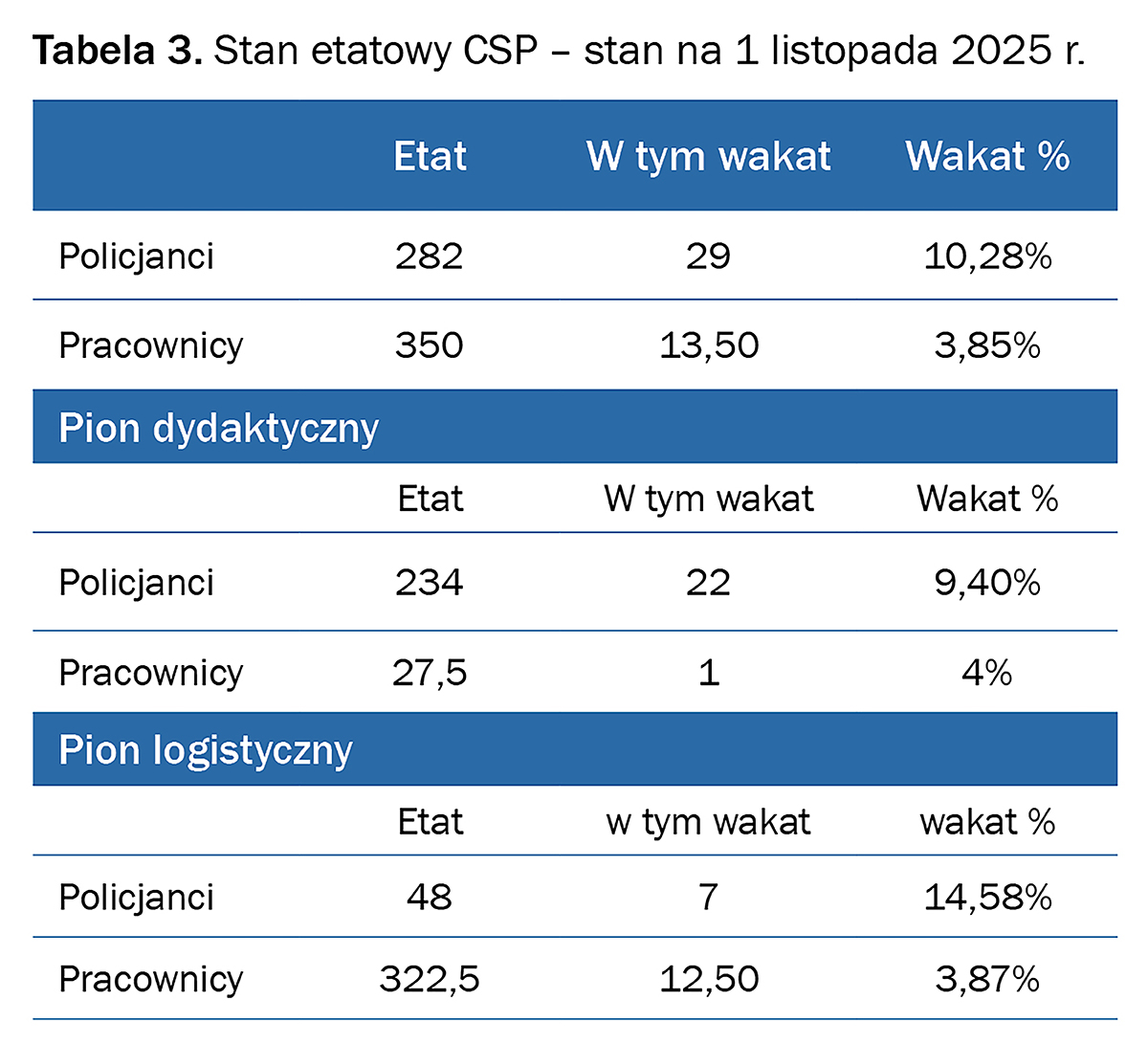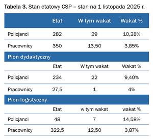 Etat CSP w Legionowie według stanu na dzień 1 listopada 2025 r. wynosi łącznie 632, w tym 282 policjantów i 350 pracowników.