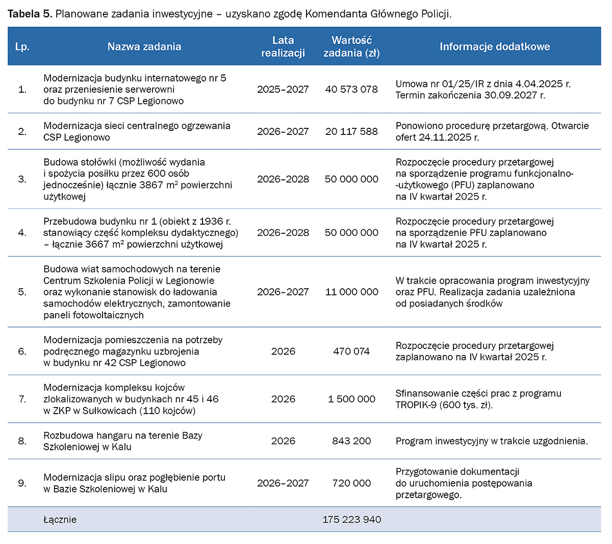 Centrum Szkolenia Policji w Legionowie planuje pozyskać dofinansowanie prac termomodernizacyjnych obiektów internatowych oraz montażu instalacji paneli fotowoltaicznych. Wstępna wartość zadania została oszacowana na kwotę 48 091 457 zł.