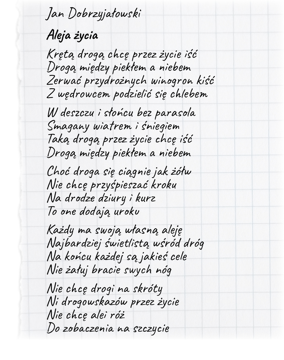 W życiu każdego człowieka ważni są ludzie, dlaczego więc nie wspomniałem o kolegach, z którymi przyszło mi pracować tyle lat? Ponieważ każdy z nich ma swoją historię i swój punkt widzenia, o których może sam chciałby opowiedzieć. Po latach pracy i obserwacji podzieliłem ludzi na trzy kategorie. Twórcy, którzy tworzą rzeczywistość. Odtwórcy, którzy naśladują. I tacy, którzy chcą przetrwać lub żyją tylko z krytyki. I ci ostatni mają najtrudniej, bo oni minęli się z powołaniem. Dlatego kieruję przesłanie do młodych policjantów: ,,Nigdy nie rezygnujcie z tego, co naprawdę chcecie robić. Człowiek z ambicjami choć nie ma lżej, to na pewno jest silniejszy od innych”. Dzisiaj młodzież często szuka spokoju i komfortu, a tego Policja nie gwarantuje. Policja, zwłaszcza przy obecnych brakach kadrowych, działa jak karetka pogotowia na sygnale i to ciągle w niedoczasie. Ludzie, przeciążeni obowiązkami, uciekają ze służby. Finansowy system motywacyjny próbuje zatrzymać policjantów w służbie, a złagodzony system naboru próbuje pozyskać nowych kandydatów. Walka o przyszłość polskiej Policji trwa. Powodzenia!