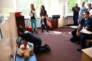 - pokaz procedury udzielania pierwszej pomocy przedmedycznej, w tym resuscytacji krążeniowo-oddechowej (RKO) z użyciem fantomów oraz automatycznego defibrylatora AED,