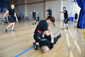 - zwiedzanie hali taktyki i technik interwencji, w której przedstawiono taktykę i techniki interwencji policyjnych stosowane w sytuacjach zagrożenia; pokaz nadzorował podinsp. Krzysztof Kozyra, Zastępca Kierownika Zakładu Interwencji Policyjnych,