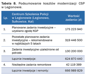 Opracowanie strategii modernizacji Centrum Szkolenia Policji w Legionowie wymagało zarówno analizy stanu obecnego, w tym inwentaryzacji stanu obiektów i infrastruktury oraz wyspecyfikowania potrzeb w zakresie inwestycji i remontów oraz oszacowania ich kosztów, jak i stworzenia pewnej wizji przyszłości, tak aby zapewnić optymalne warunki do realizacji szkolenia i doskonalenia policjantów w szybko zmieniającym się świecie. Zadania modernizacyjne wyceniono łącznie na około 667 milionów złotych. Część z tych zadań jest już w trakcie realizacji. Wykonanie pozostałych będzie uzależnione od decyzji kierownictwa Policji oraz zapewnienia środków.